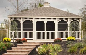 Gazebo owners can select between wood or vinyl, and can cover the sides with screens or windows. Just covering three sides facing the most common wind direction is usually sufficient. Because side covers are held in place by two vertical slats it’s a simple task to set them up as needed. Vinyl gazebos are similarly equipped.